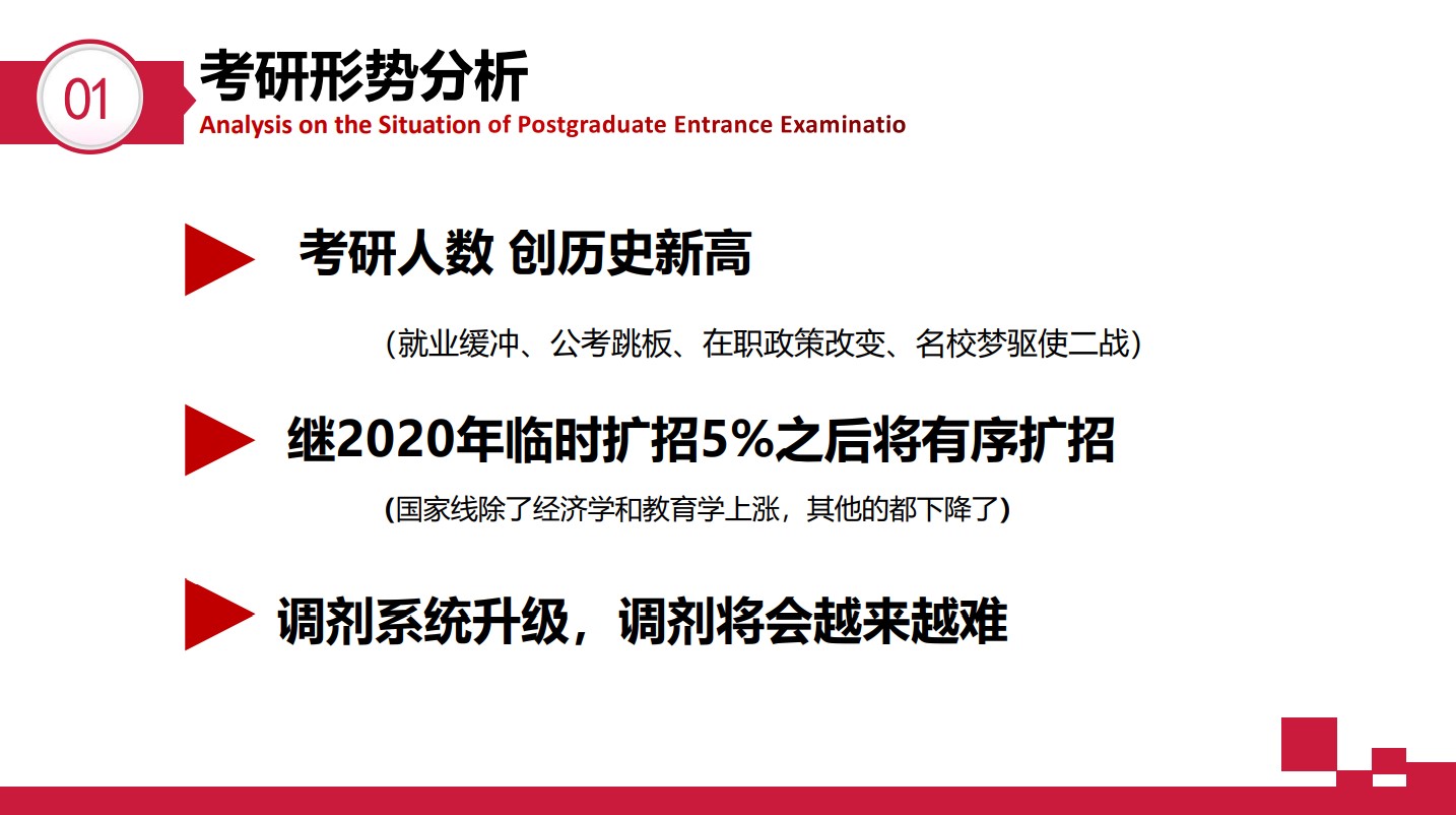 在考研形势分析的介绍中,高继英老师提到,当前考研面临三种形式:考研人数暴增创历史新高;继2020年临时扩招5%之后将有序扩招;调剂系统升级调剂将会越来越难。由于就业缓冲、公考跳板、在职政策改变、名校梦驱使二战等原因,考研人数增加导致考研压力增大。但同时国家线分数有所调整,今年国家线除经济学和教育学上涨,其他科目都有所下降。