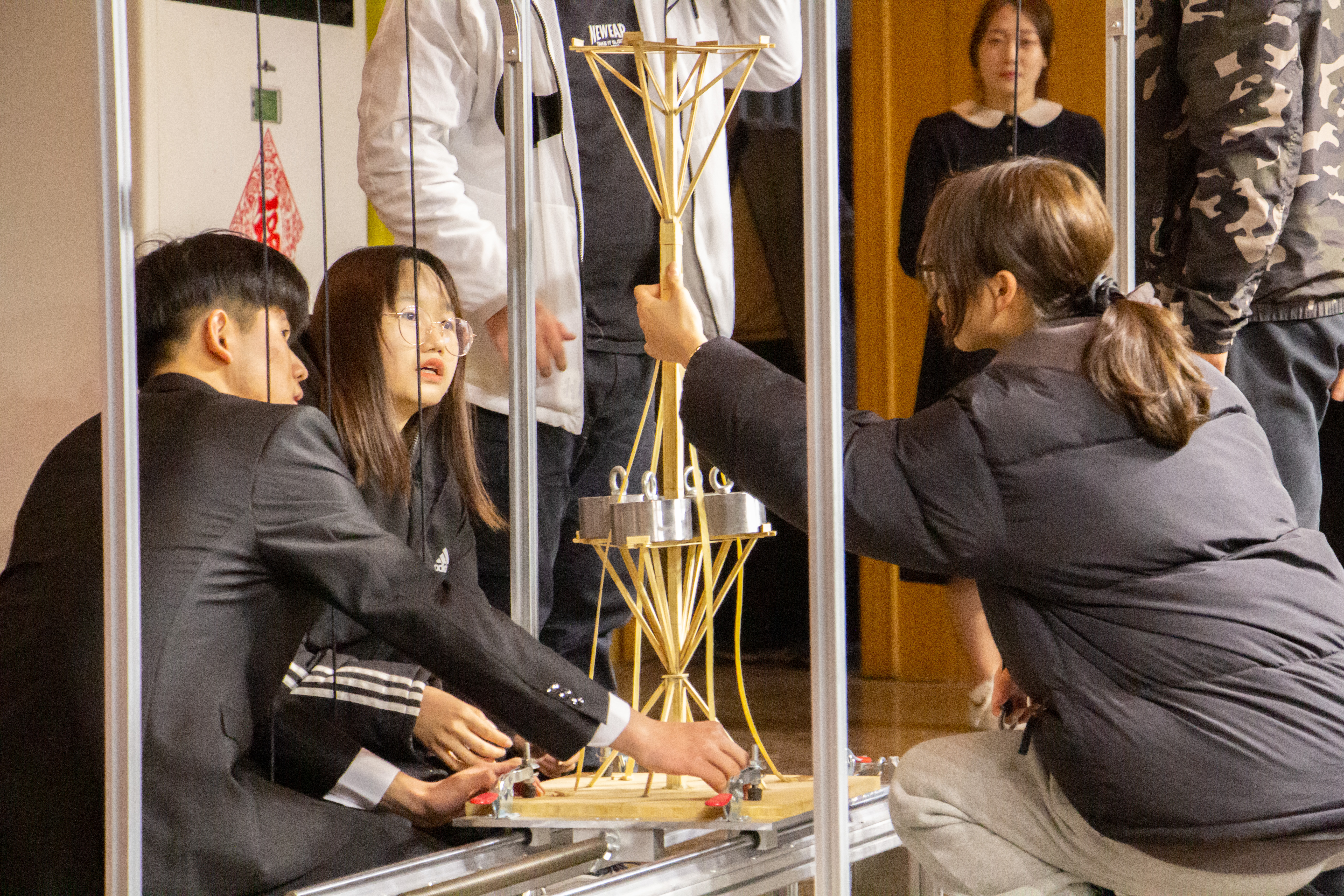 挺过一级加载的小组,在观众的欢呼鼓掌声中,开启第二段惊险之旅。二级加载将在一级加载的基础上再加砝码,参赛队伍可以在12kg、15kg、18kg三种配重中任选一种加码挑战。二载环节赛况更为胶着,观众们都目不转睛,齐刷刷将目光聚焦在加载平台上。“在真正感受到总重15kg的五个砝码,加在重心如此之高的第二个加载面上的时候,竹条轻微的挤压声让我们犹豫了,但最后还是决定放手一搏。虽然最终没有成功,但整个塔保存得还算完好。”参赛选手熊宁同学说。