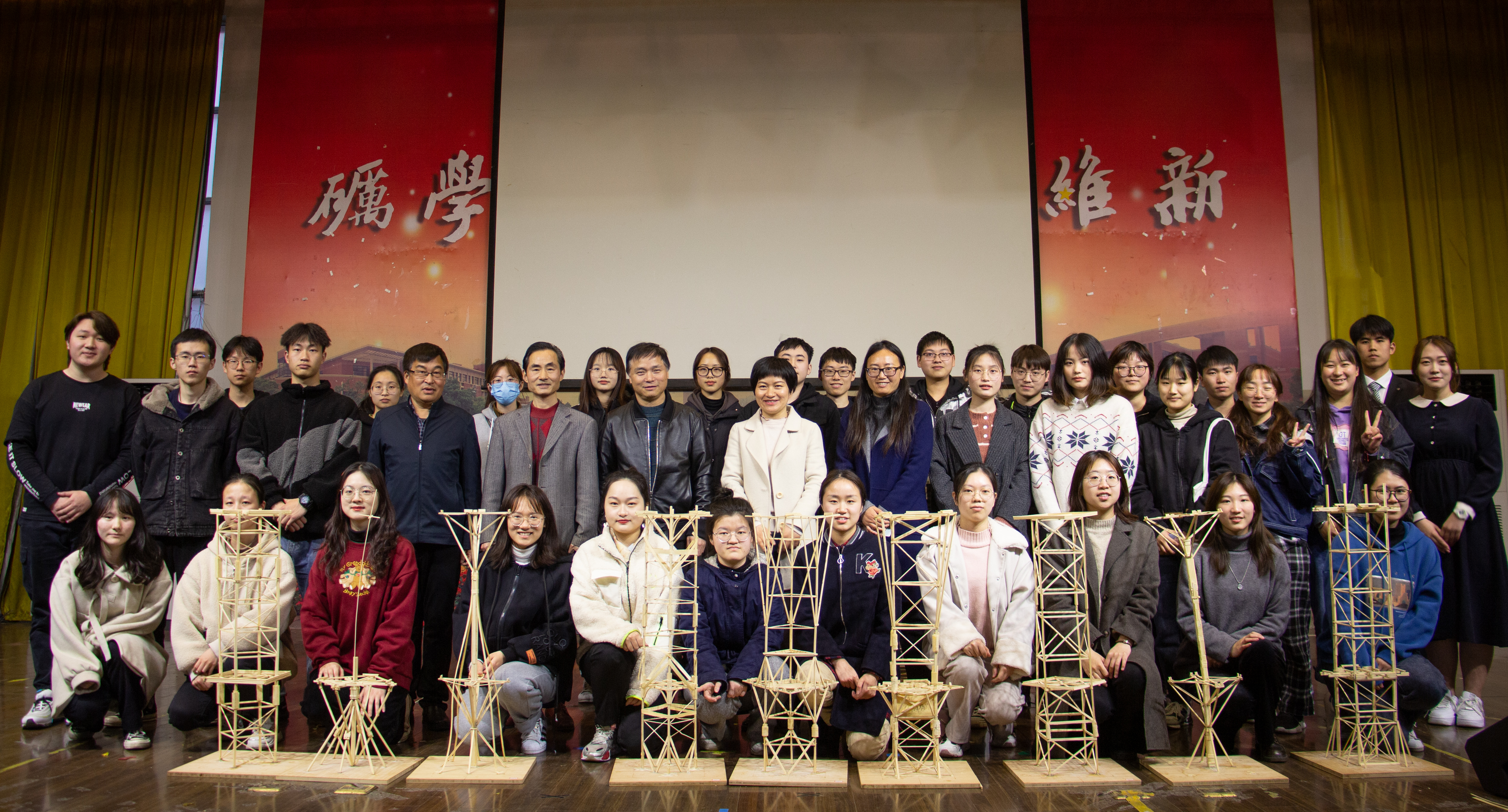 全部小组展示完毕后,评委老师章旭健与陈志文分别对本次比赛做了点评和总结。章旭健老师肯定了参赛队伍在模型结构形式和制作方面的精彩表现,同时指出,各小组应当加深对比赛题目的理解。陈志文老师则总结了本次比赛的两大难点——一是最近采用的更加环保的拼装式标准,二是模拟地震波的横向冲击,并鼓励同学们积极参加此类竞赛,培养创新思维和动手实践能力。