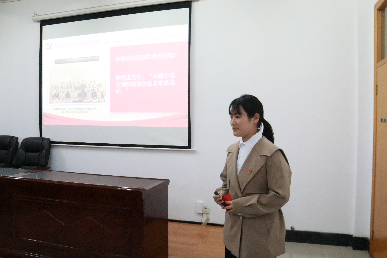 叶龙杰同学以《辉煌路·先辈志·教育梦》为题,通过《觉醒年代》带领大家致敬那些在黑暗中摸索前进、于迷雾里燃灯奔走的先辈党员,致敬无数个前仆后继的“陈延年”。他联系十四五规划的“教育强国”战略,着眼于民族地区的教育事业,向大家介绍了母校景宁中学“低进高出”的教育路。教育前锋们的初心不偏不倚,作为师范学子的他也已连续2年回母校定向述职,毅然做“觉醒青年”。