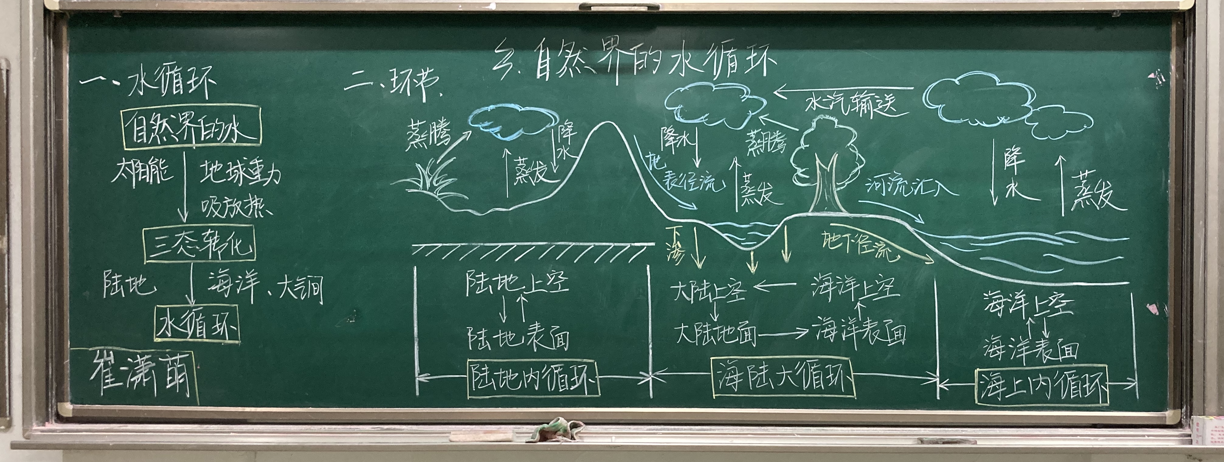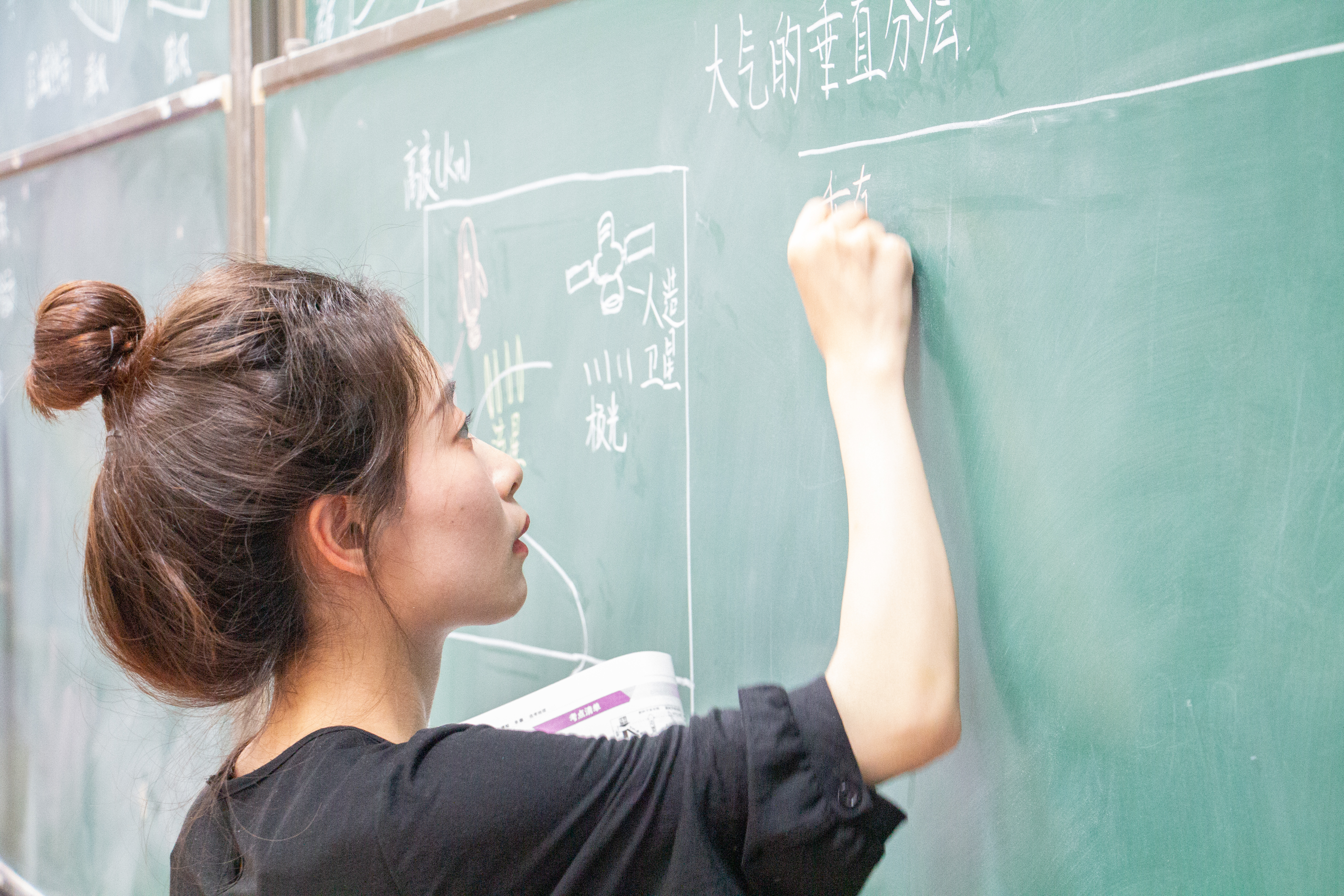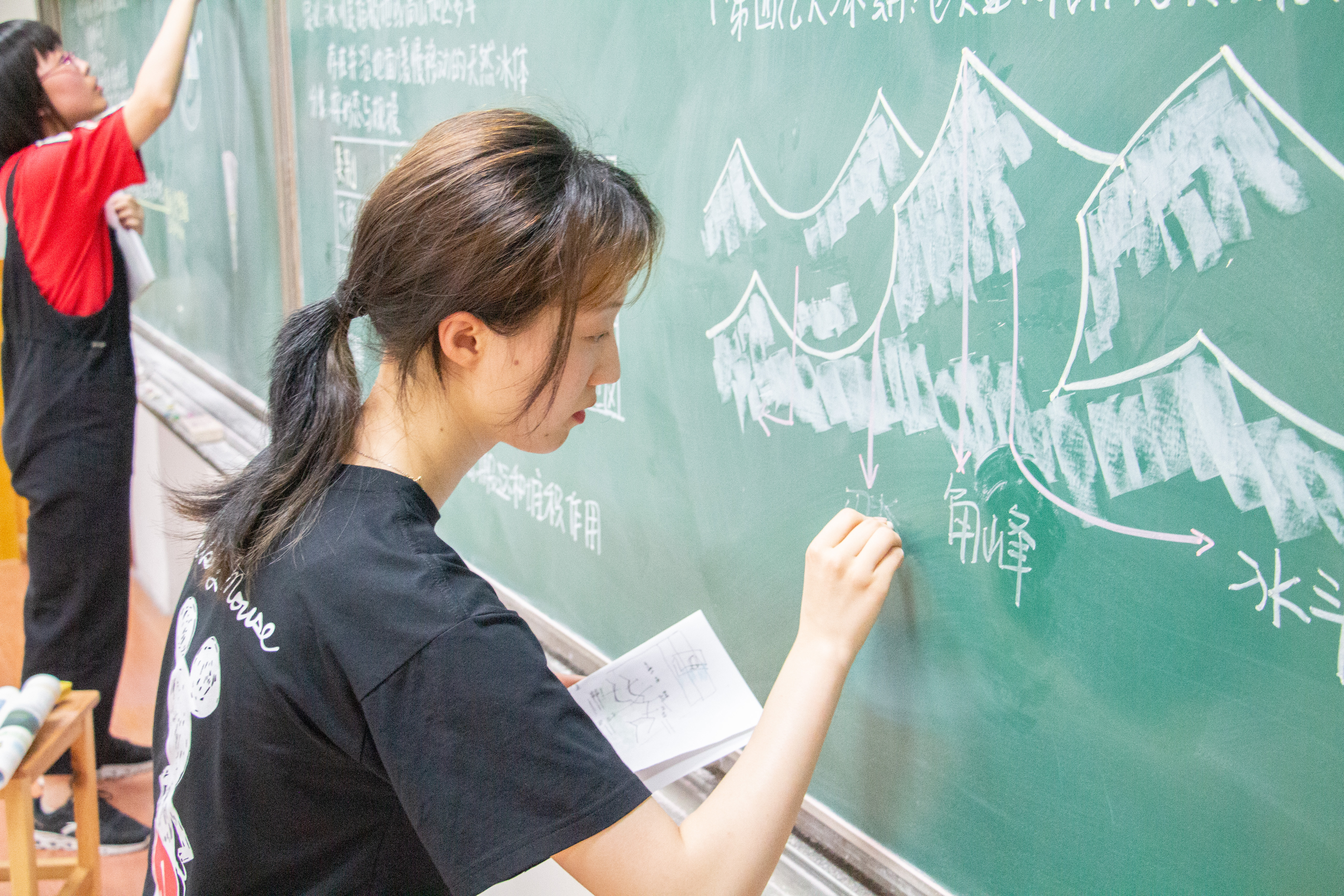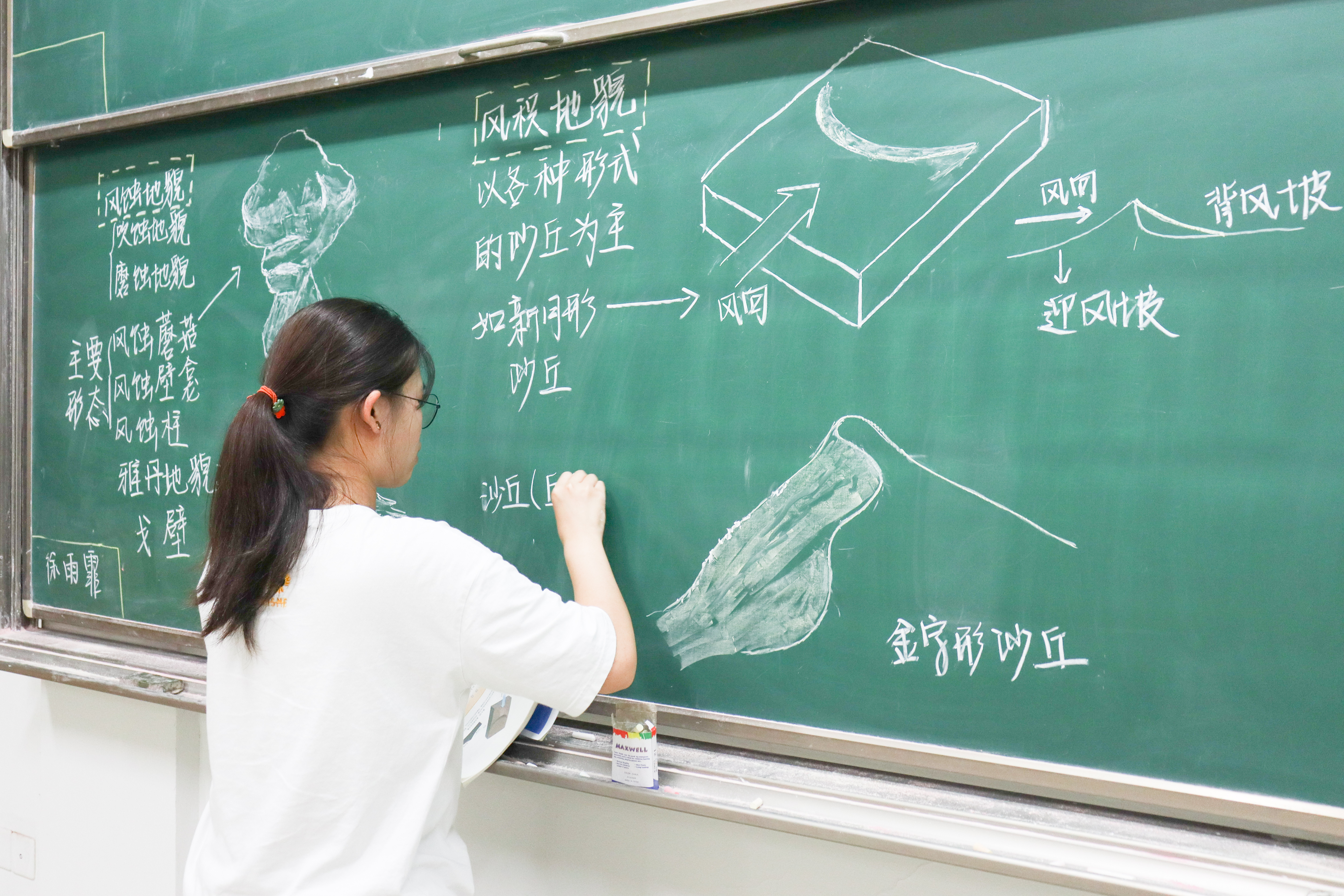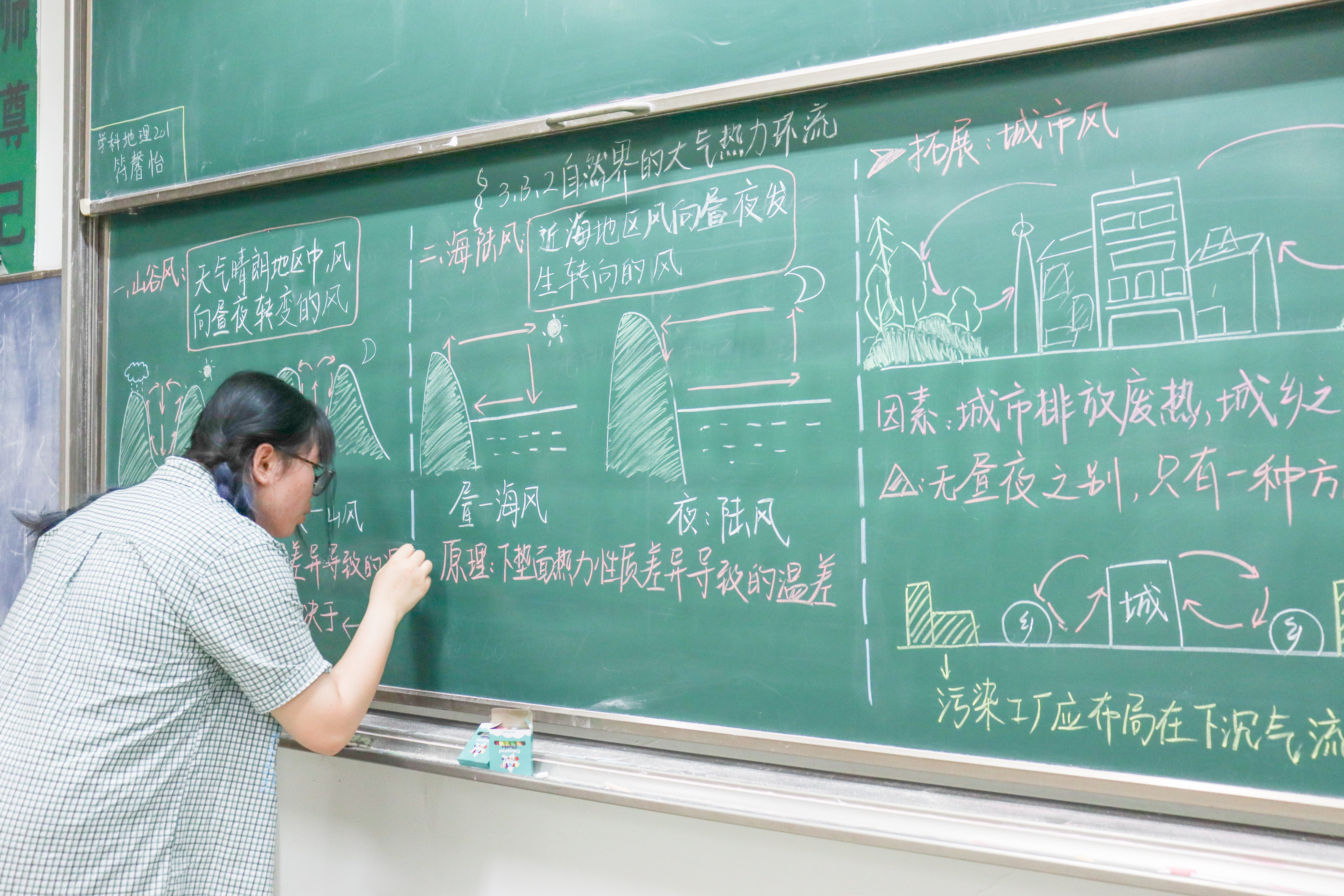 本次比赛共有33名选手参赛,18:00钟声敲响,比赛正式开始。每位参赛选手提前半小时抽取板书板画主题,在知晓比赛课本题目后选手们回到座位构思酝酿,不时翻阅地理必修一教材。凭借对教材内容与课标要求的熟稔把握和自身丰富的地理专业知识储备,未来地理教师们思绪纷飞,在准备的草稿纸上奋笔疾书。30分钟的准备时间转瞬即逝,选手们走上讲台,用一本教材,一只粉笔,用一笔一画,一撇一捺绘出自己的课堂。