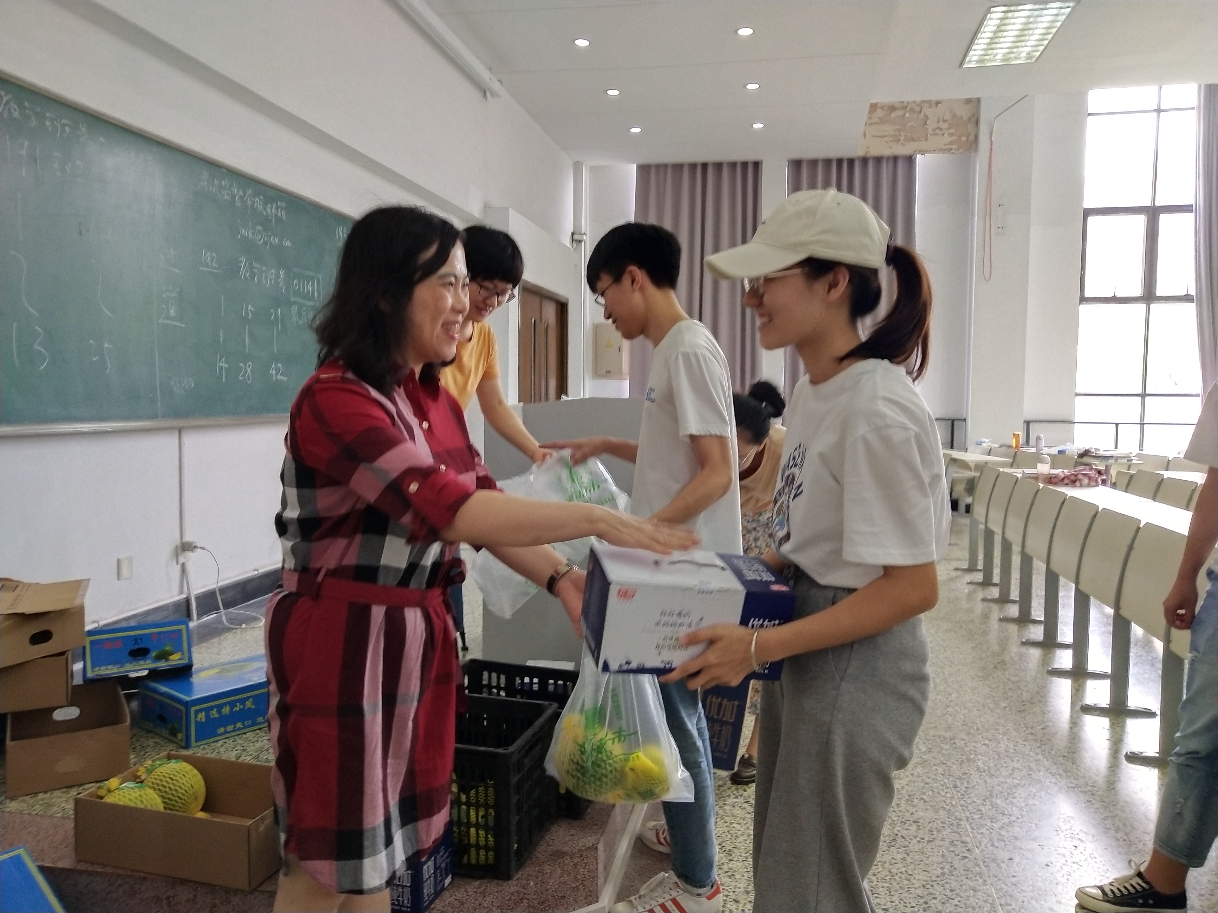 会后,学院领导为留校考研学子分发水果、牛奶等物资。