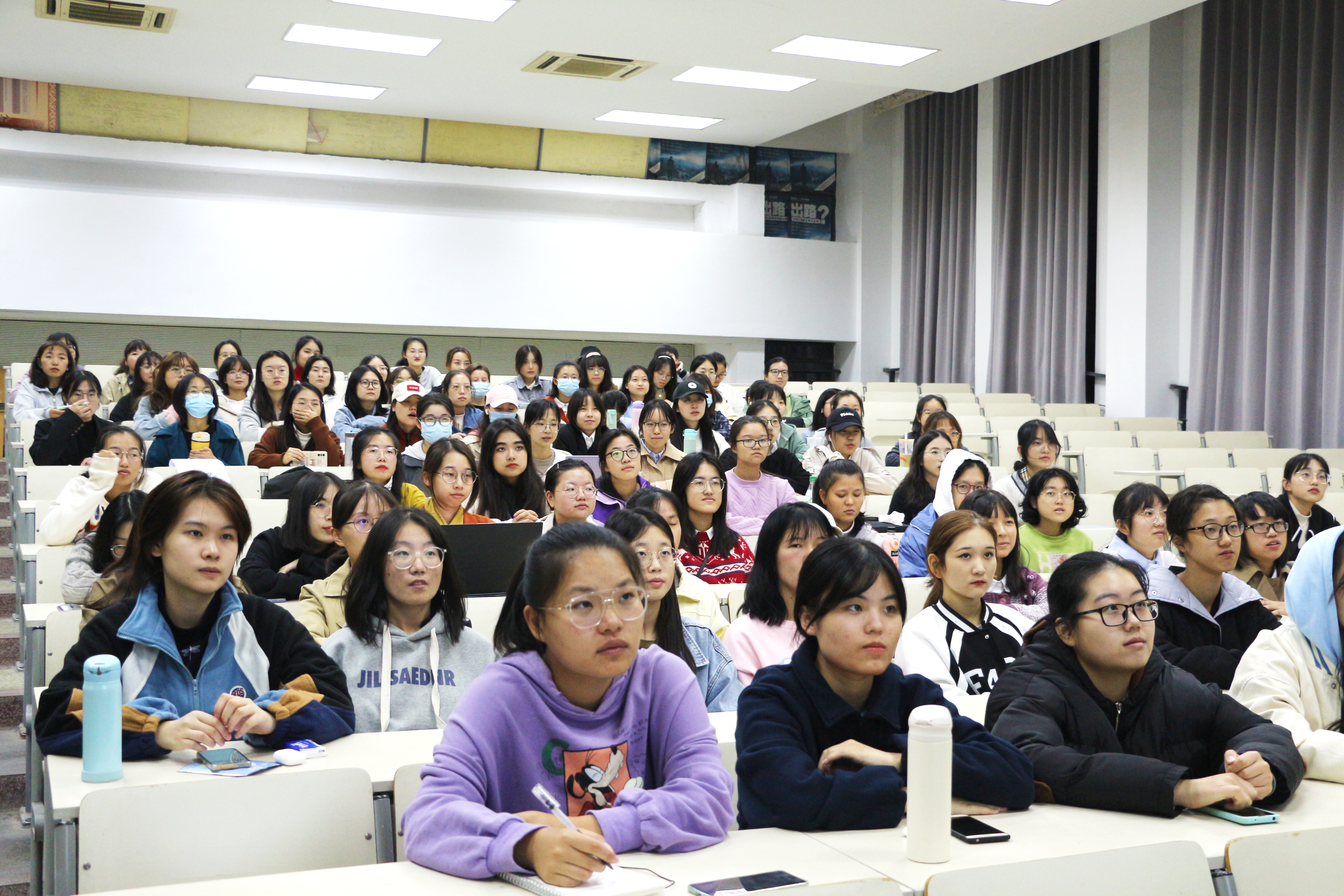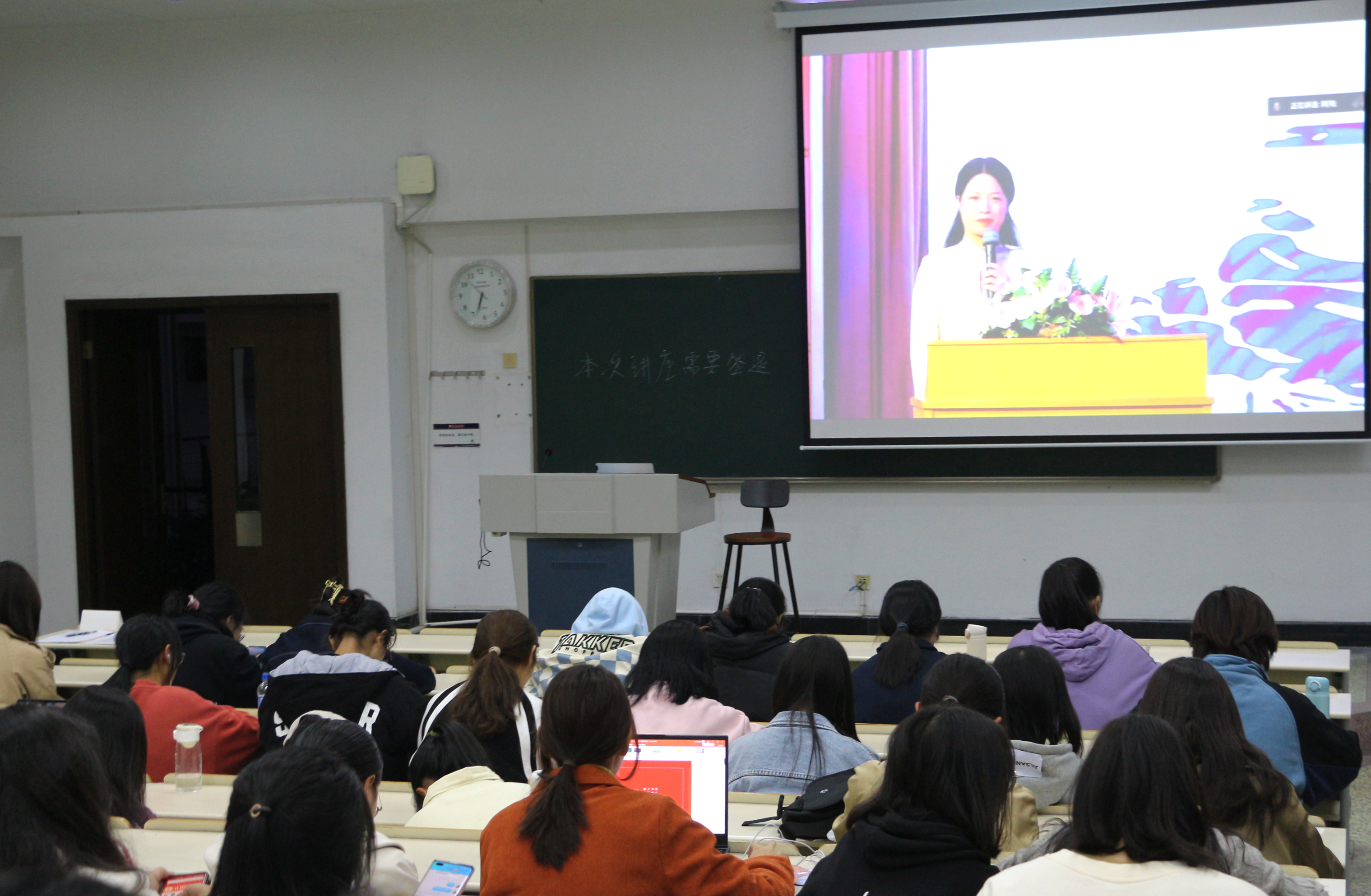 10月22日晚,为庆祝中国共产党百年华诞,激励广大女同胞投身全面建设社会主义现代化国家的新征程。我校于大学生活动中心二楼举办“启梦浙师”女性论坛系列讲座。外国语学院胡美馨教授,化学与生命科学学院教授童国秀教授,体育与健康科学学院骆春燕副教授,人文学院黄沚青副教授担任此次宣讲嘉宾。我院大一、研一女生于25幢302教室观看讲座直播。