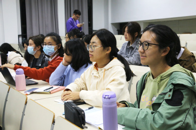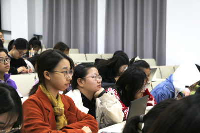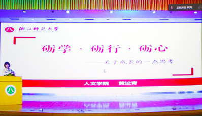 黄沚青副教授以校训为引,讲述“玫瑰”如何才能更加动人。她认为学生应做到“砺学、砺行、砺心”。“砺”意为磨,首先要在“学”中磨,学术研究本身就是一个积累的过程,丘山积卑而为高,学识广博而为成。其次要在“事”上磨,“不经一事,不长一智”。只有打磨好每一件小事,方可树立信心,遇事不倒。最终要在“心”中磨,“天下大事,必作于细”,只有细心对待每一件小事,才能做好尽心完成每一件大事。在这个里快节奏的时代,黄沚青鼓励同学们沉下心不断打磨自己,潜心关注“研值、言值、颜值”,精细研读知识,将自己最好的精神面貌展现给世界,借用优秀的语言表达能力弘扬中国优秀的传统文化。