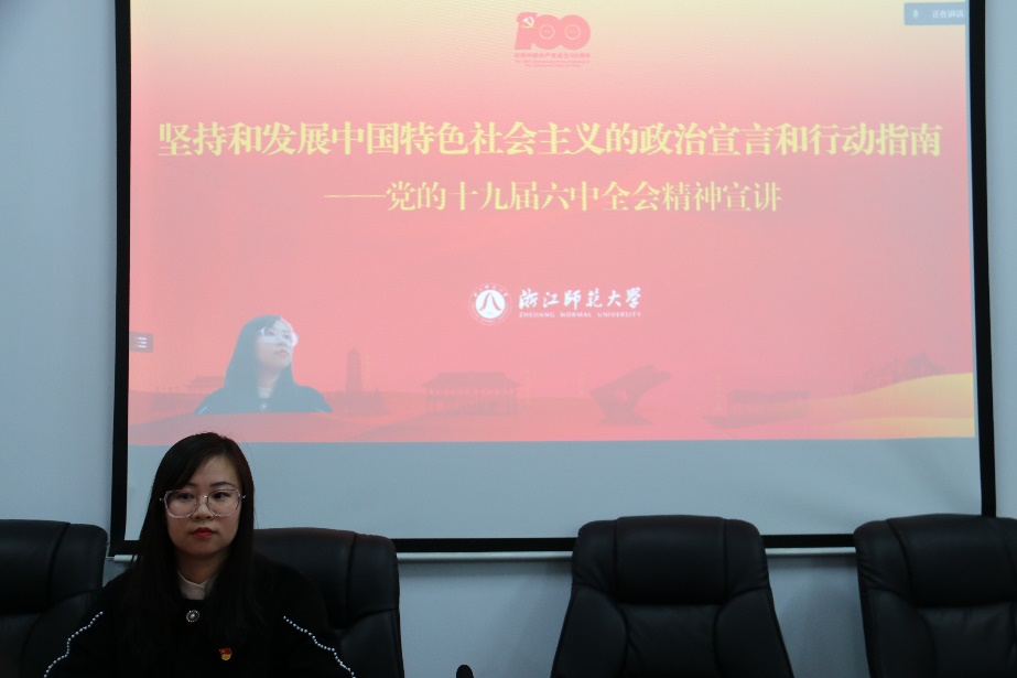 12月3日,地理与环境科学学院在17幢618教室开展十九届六中全会精神宣讲会,环科系教师党支部宣传委员、校8090宣讲团成员尉小旋从导论、百年奋斗篇、经验启示篇、学习践行篇四个方面带领学院本科生深入学习会议精神。
