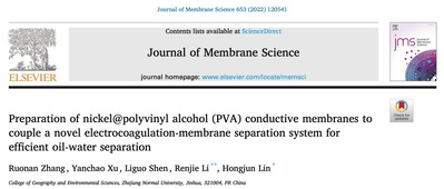 近日,我院林红军教授课题组(浙江师范大学地环学院膜法课题组)研究生张若楠在膜技术期刊《Journal of Membrane Science》上发表题为“Preparation of nickel@polyvinyl alcohol (PVA) conductive membranes tocouple a novel electrocoagulation-membrane separation system for efficientoil-water separation”(《Ni@PVA导电膜的制备及其构建用于高效油水分离的新型电絮凝-膜分离系统》)的文章。《Journal of Membrane Science》是膜技术领域和化工领域的顶刊。