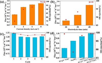 本研究提出制备表面金属化的导电膜并以之构建结合原位电絮凝和膜分离功能的复合系统的新思路,以实现高效油/水分离。本研究首先通过聚乙烯醇(PVA)固定镍纳米粒子和镍自催化化学镀镍的两步骤成功制备了镍功能化导电膜,然后以Ni@PVA导电膜和铝网分别作为阴极和阳极,并施加一定的电流密度,构建了原位电絮凝系统。这一系统在一定的电场条件(电流密度为8 mA/cm2和电解时间为20 min)下,所制备的Ni@PVA导电膜的渗透通量可达到12.0×103 L/(m2·h·bar),对水包油乳液的截留率为99.4%。这一通量性能比现有文献报道的相当截留率下的通量数值要大,显示了这一系统的优越性。本研究所提出的基于Ni@PVA导电膜的电絮凝-膜分离系统操作简单且分离效率高,在油/水乳液分离中具有广阔的应用前景。