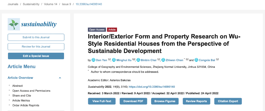 近日,浙江师范大学地理与环境科学学院“村落传统文化生态变迁”课题组、城乡规划专业本科生徐铭晖在国际期刊《Sustainability》上发表了题为“Interior/Exterior Form and Property Research on Wu-Style Residential Houses from the Perspective of Sustainable Development”(可持续发展视角下的婺派民居的内外境域研究)的研究论文。《Sustainability》为SSCI Top期刊,学生徐铭晖与导师严丹为共同一作,陈志文副教授为通讯作者,浙江师范大学为第一通讯单位。