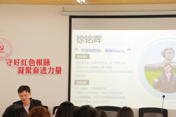 2022届城乡规划专业毕业班徐铭晖讲述了自己从小确立的专业兴趣,大学期间,专业调研中深刻感受到自己在课上学到的内容能够改变村庄中村民的生活,也更加坚信了自己选择的专业发展的道路。同时,徐铭晖也给在场党员提出三点小建议:第一,要时刻保持自己的热爱,他认为,热爱可以给自己一份保持生活的动力;第二,要维持自己的社交,朋友可以在你迷茫、困难的时候帮助你调整心态;第三,一定要保持前进的动力,不要躺平。