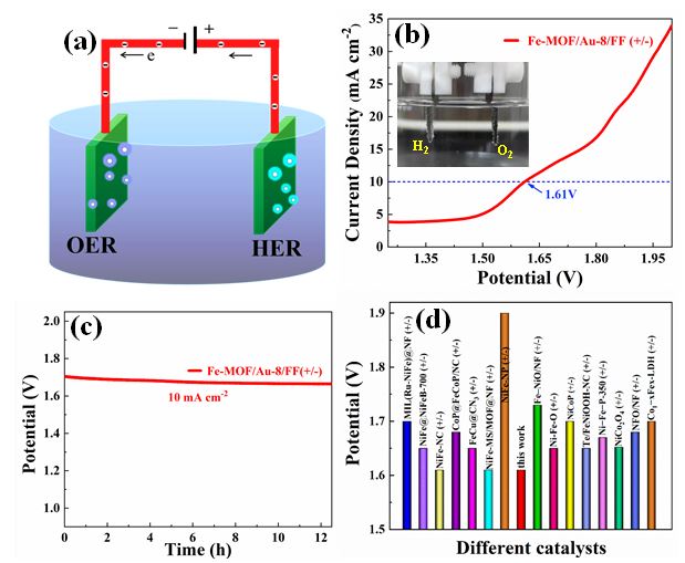 合理调控金属有机骨架(MOF)电催化剂的电子结构是提高MOF导电性的有效策略之一。本论文将铁泡沫作为导电基底和自牺牲模板制备了一系列原位生长在泡沫铁上的Fe-MOF/Au复合材料。通过调整电沉积Au的时间来调控Fe-MOF/Au复合材料的电子结构。优化后的Fe-MOF/Au复合材料作为全解水电催化剂呈现出低的水分解电压和长寿命。这一策略将为提高MOF基电催化剂的性能提供新的灵感和创意。