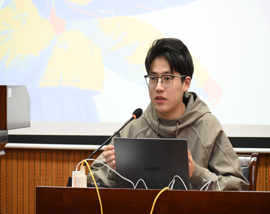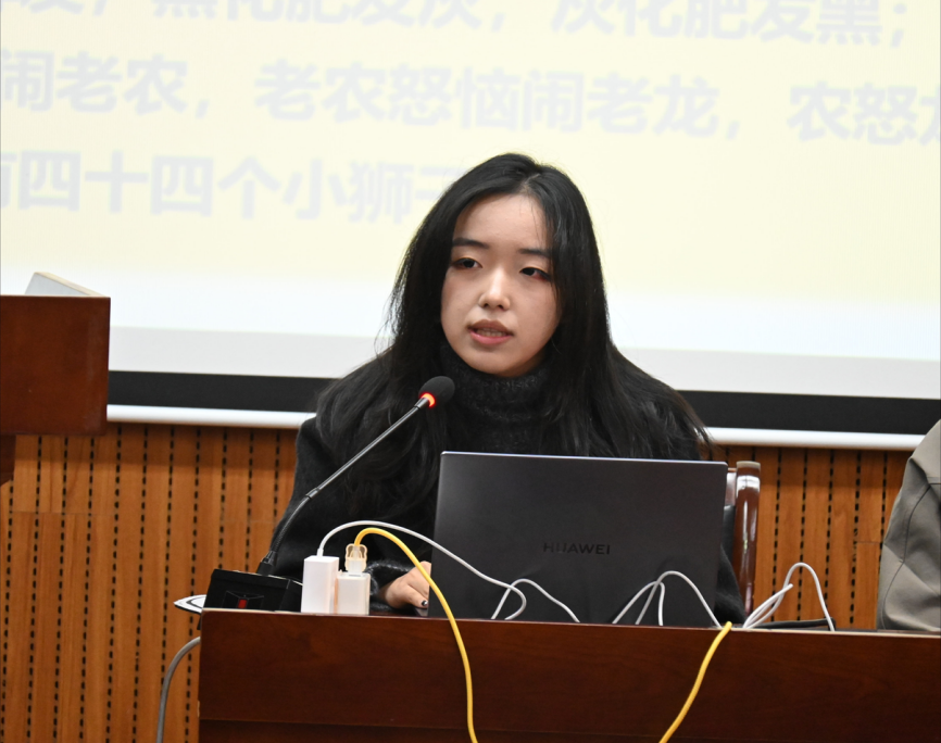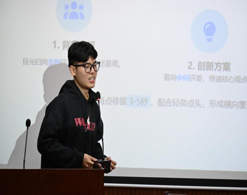 郑戈弋和裘昊宸从信息传递、情感连接与专业形象三个维度,系统阐释普通话在答辩场景中的关键作用。他们从系统性发声训练入手,精研声韵规范与鼻音辩正,融入逻辑重音与气息调控,全面提升语言表达的精度与张力。此外,裘昊宸现场演示唇部打嘟、舌尖顶颚等专业技巧帮助激活发声器官,为从容表达奠定基础。