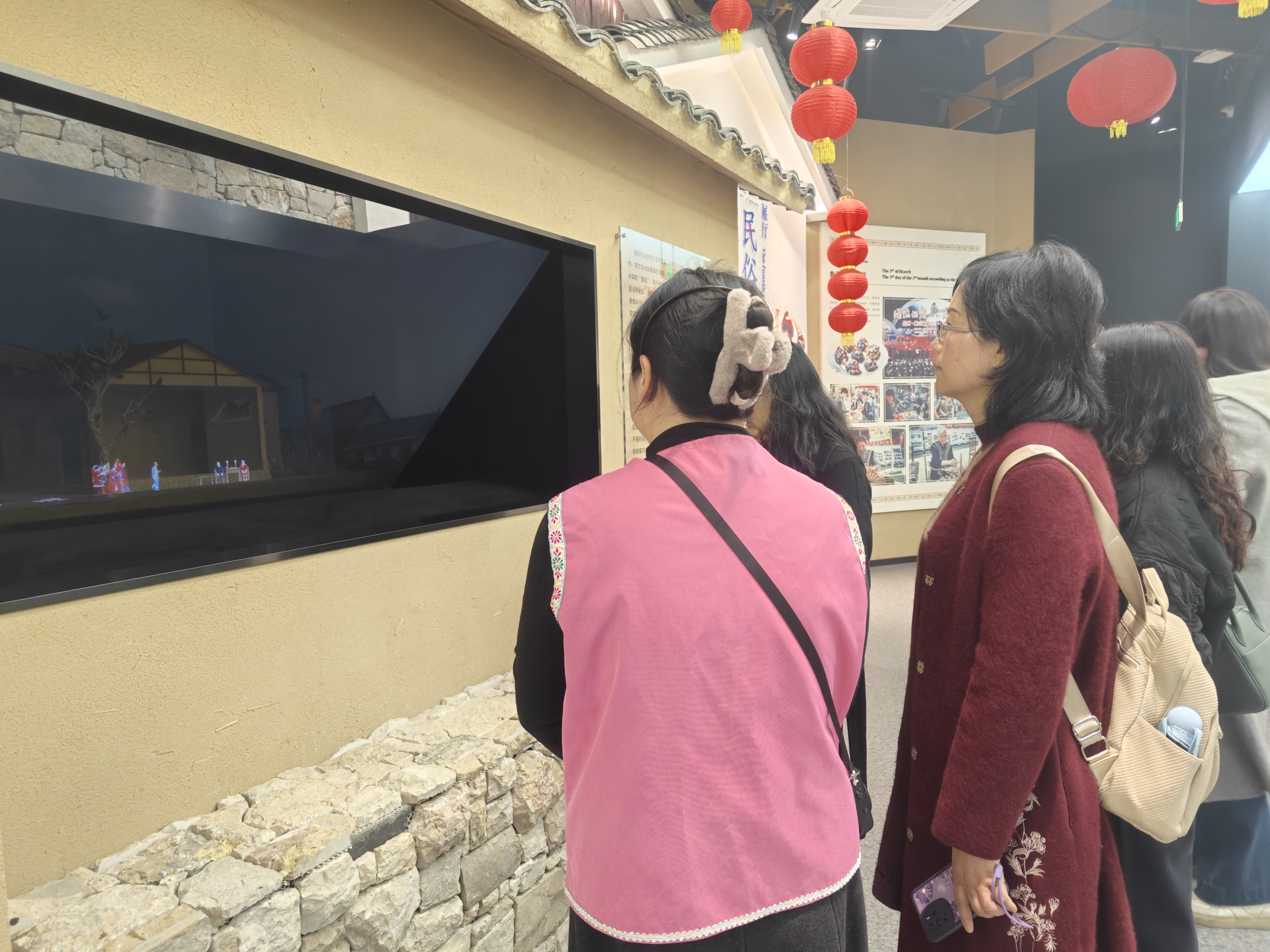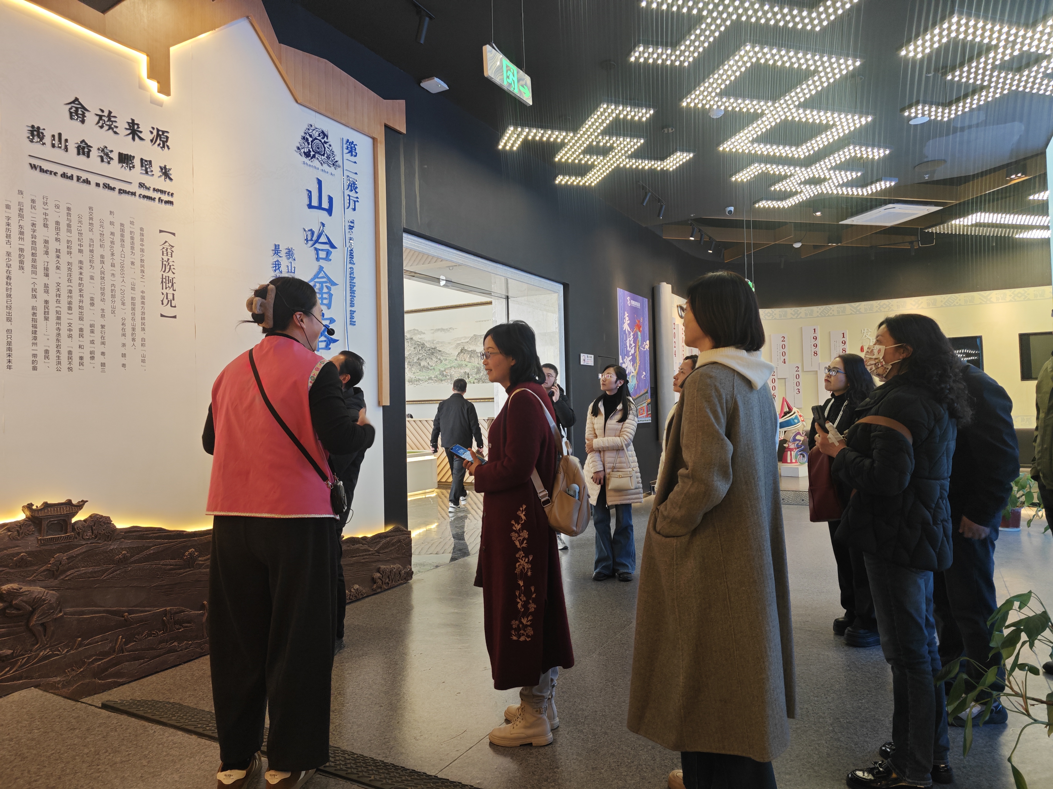 12月12日下午,活动首抵桐庐县莪山畲族馆,通过实地参观深入了解畲族文化传承与乡村发展脉络。莪山畲族馆以“畲乡风俗”与“民族服饰”两大基本陈列为核心,系统呈现畲族文化的深厚底蕴。在“畲乡风俗”展区,主要围绕畲族在莪山的发展变迁,展示其特色饮食、歌舞等生产生活场景。“民族服饰”展区展出了历届“中国(浙江)民族服饰展演”获奖作品,通过纺织、刺绣等工艺展现服饰上的图腾、历史与风俗内涵。此外,馆内还设有畲乡文体中心、图书馆,并配套农产品文创集市等功能空间,为文化展示与乡村服务提供了综合平台。